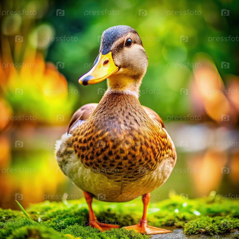 Очаровательная утка, стоящая на зеленом мохе от Тихого садового пруда. генеративный ИИ