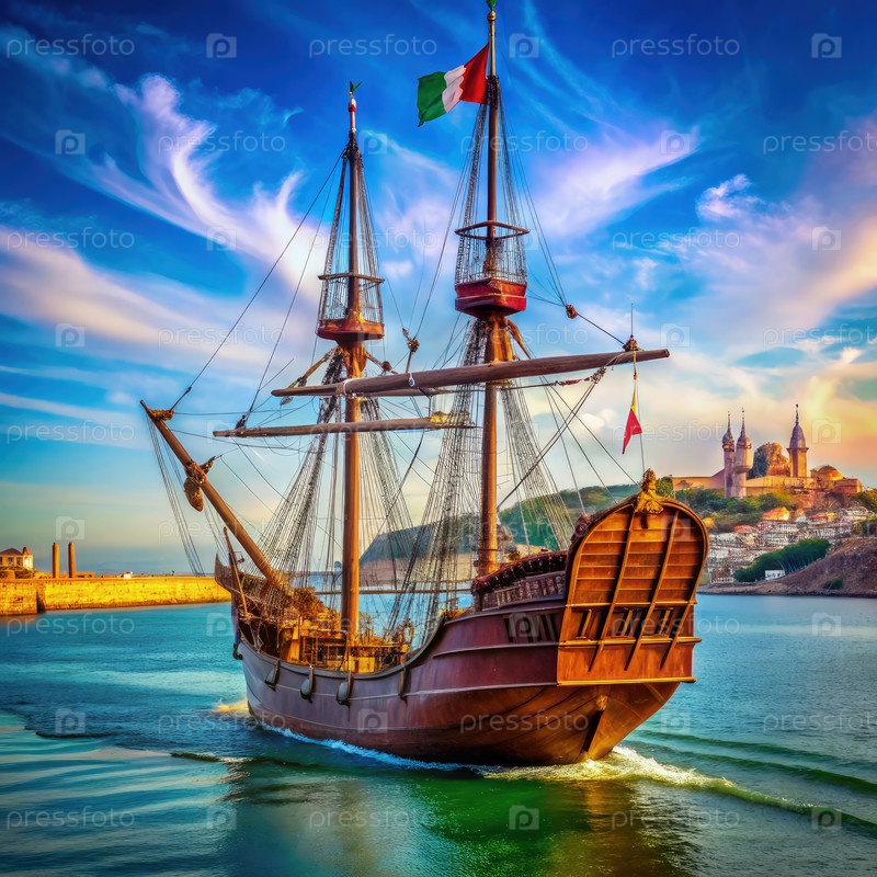 Исследование исторической каравелы Педро Альвареса Кабрала в спокойных водах на закате