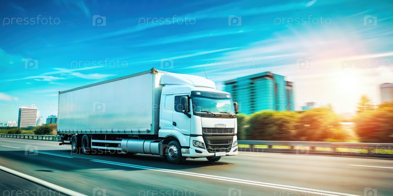 Полугрузовик едет по шоссе через город в солнечный день. генеративный белый ИИ