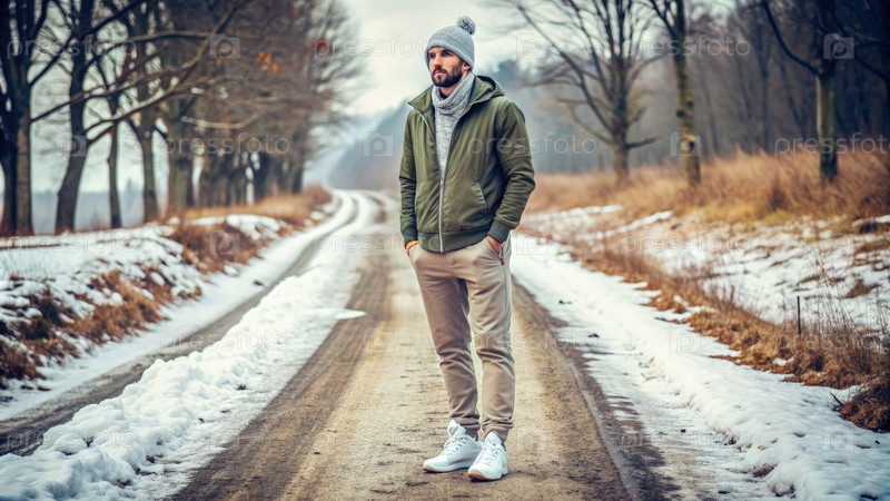 Стильный итальянский мужчина в бейню и зимнем наряде стоит на снежной сельской дороге