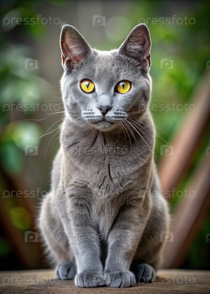 Грациозный серый кот с ярко-желтыми глазами позирует на открытом воздухе в пышной садовой обстановке