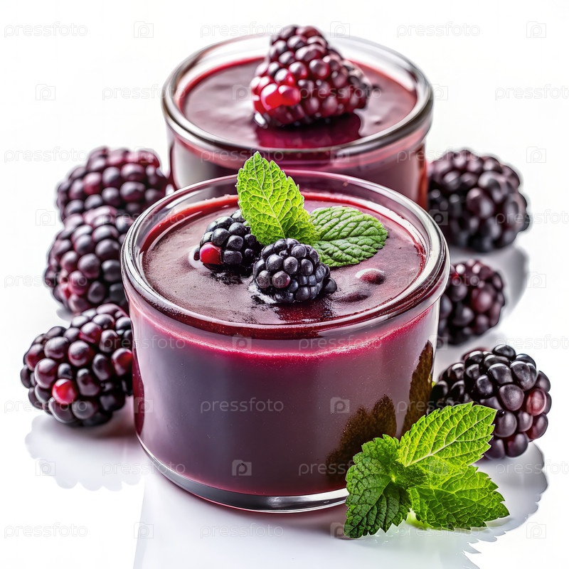 Вкусное чернильное пюре подается в стеклянных банках, окруженные свежими ягодами и листьями мяты