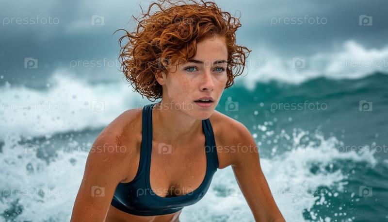 Спортивная женщина в бикини ловит большую волну во время серфинга в голубом океане