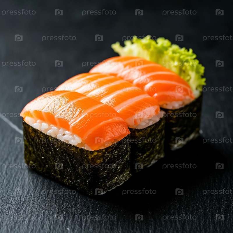Деликатные японские кусочки суши с красной рыбой, изолированная на черном фоне
