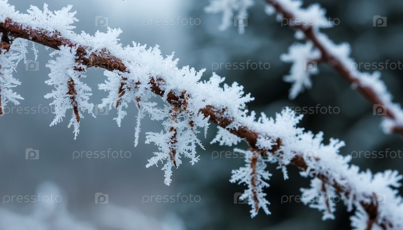 Макросъемка кристаллов льда, образующих мороз на ветвях и ветках
