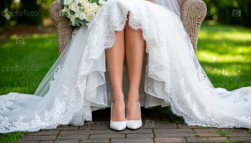 Очаровательные ноги невесты в белых туфлях заглядывают из кружевного свадебного платья