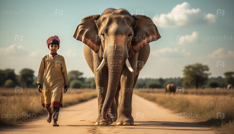 Молодой индийский ребенок в красочных этнических нарядах стоит на сельской дорожке с слоном, поднимая пыль под солнечным светом