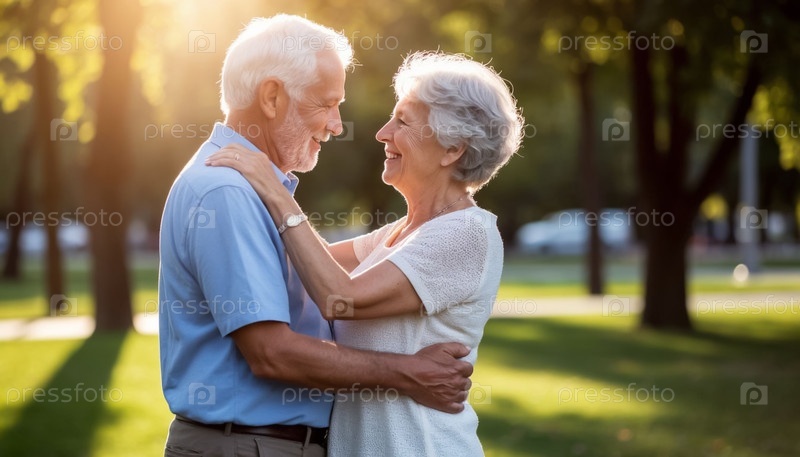 Счастливая пожилая пара танцует вместе в солнечном летнем парке Joyful Retirement Lifestyle Concept