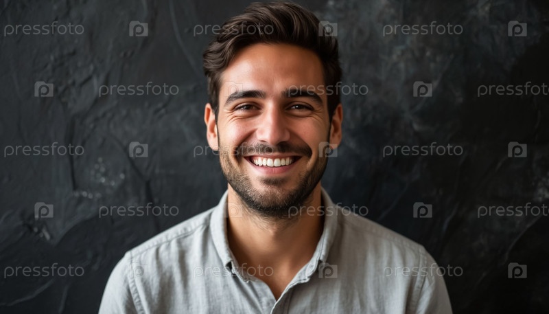 Радостный мужской портрет Гранж фон Темные тона Эмоциональное выражение Уличный стиль