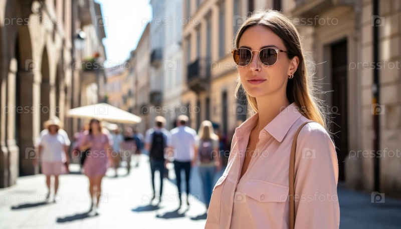 Летний день в европейском городе с женщиной, одетой в розовый верх и солнцезащитные очки