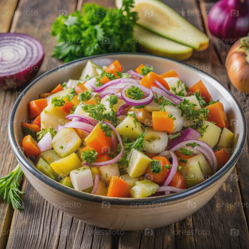 Свеже нарезанный салат с красным луком, морковью и петрушкой в деревянной миске