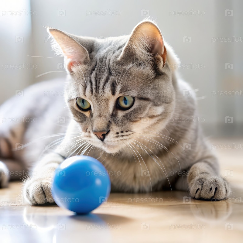 Светло-серый кот играет с голубым игрушечным мячом на деревянном полу в помещении днем