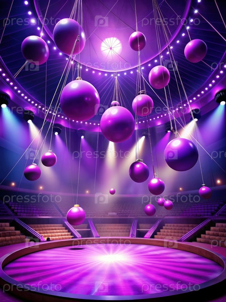 Фиолетовые шары, подвешенные над цирковой сценой под яркими огнями