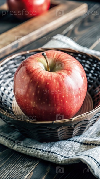 Свежевыбранное красное яблоко отдыхает в тканей корзине на деревянном столе