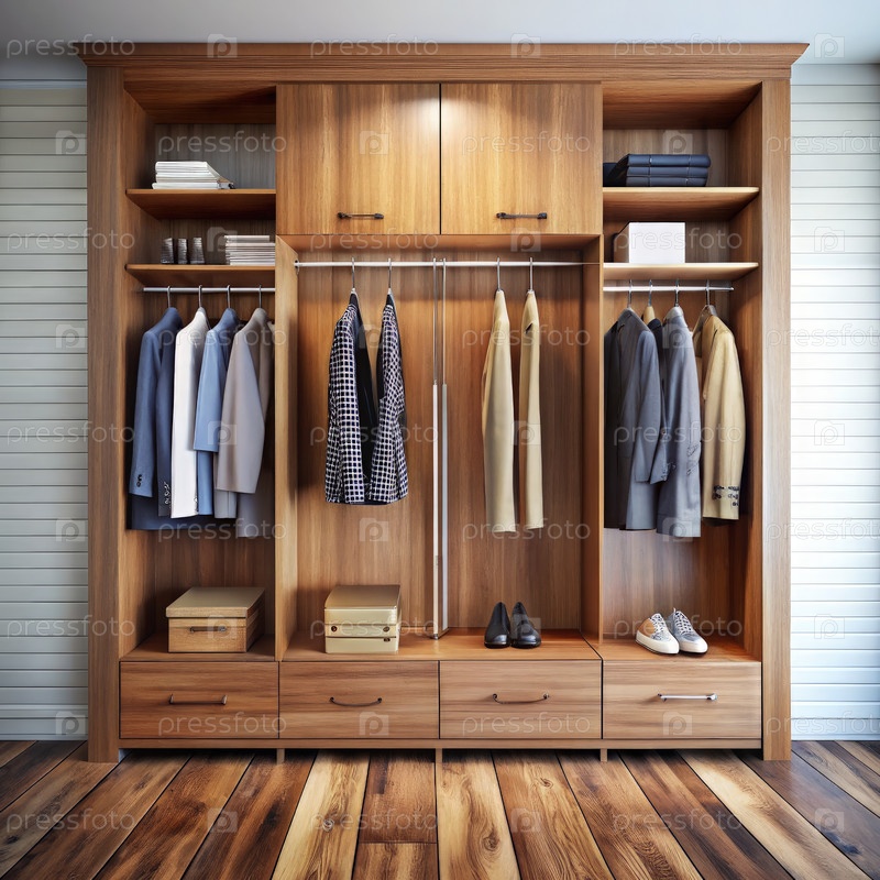 Стильный деревянный гардероб с элегантными аранжировками одежды в современном интерьере