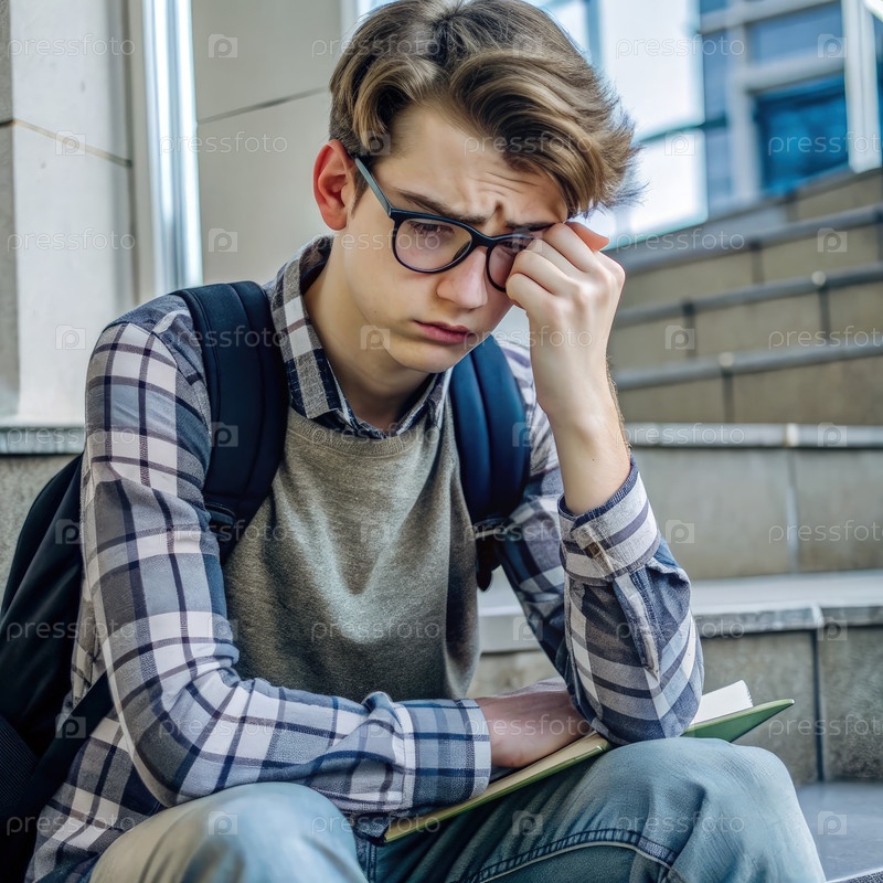 Обеспокоенный молодой студент, сидящий на ступеньках с учебником
