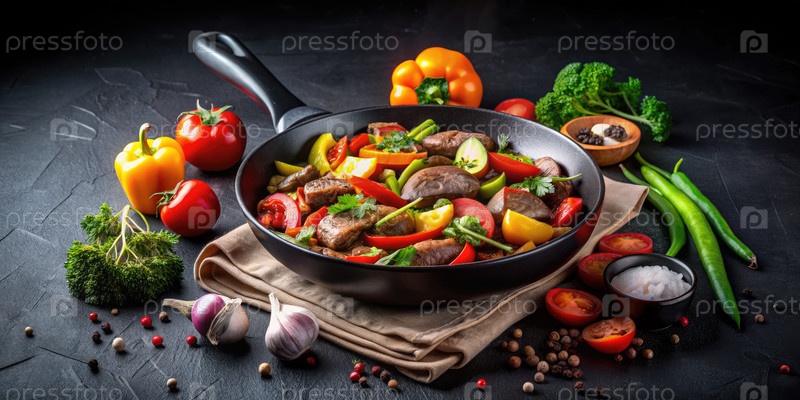 Черная кастрюля, наполненная мясом и красочными овощами на темной столешнице