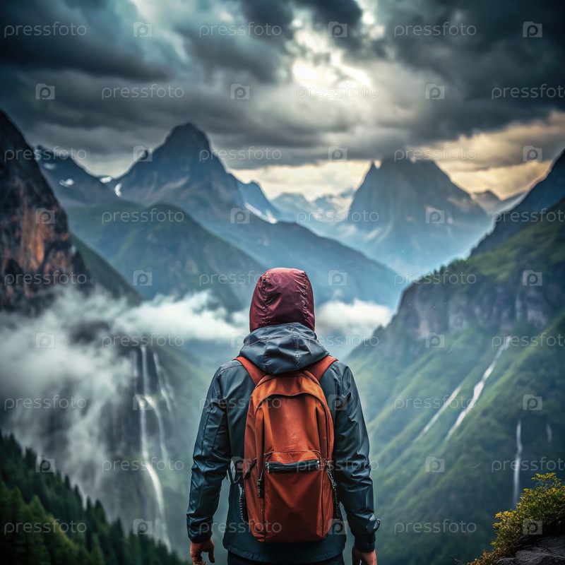 Сольный путешественник смотрит на горный хребет в пасмурный день