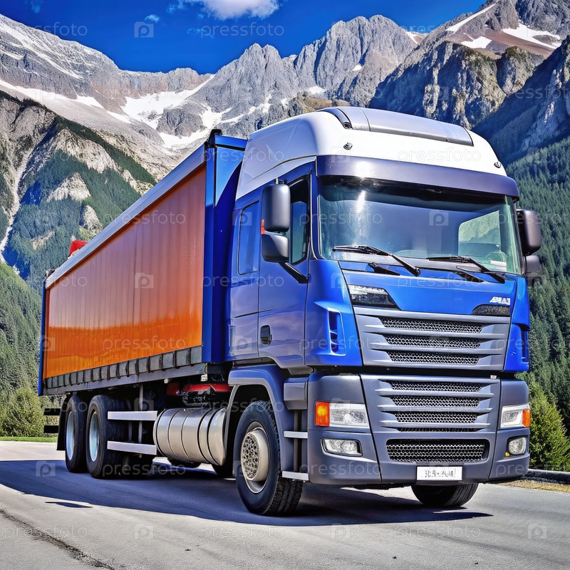 Синий полугрузовик проезжает через горный перевал в солнечный день
