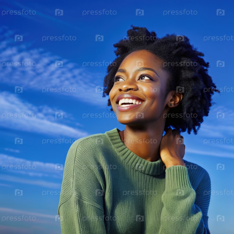 Женщина в зеленом свитере, улыбающаяся против голубого неба