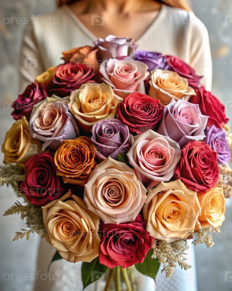 Красивое расположение красочных роз, удерживаемых женщиной в светлой комнате