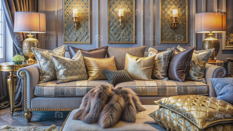 Гламурный дизайн интерьера гостиной с роскошными подушками и декором
