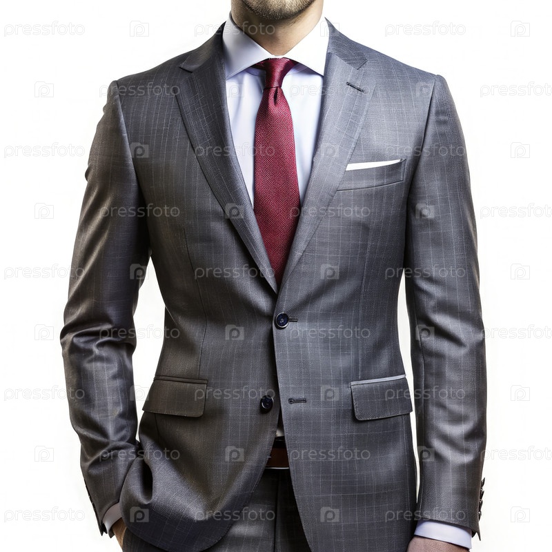 Мужчина в сером костюме с бургундским галстуком стоит с руками в карманах