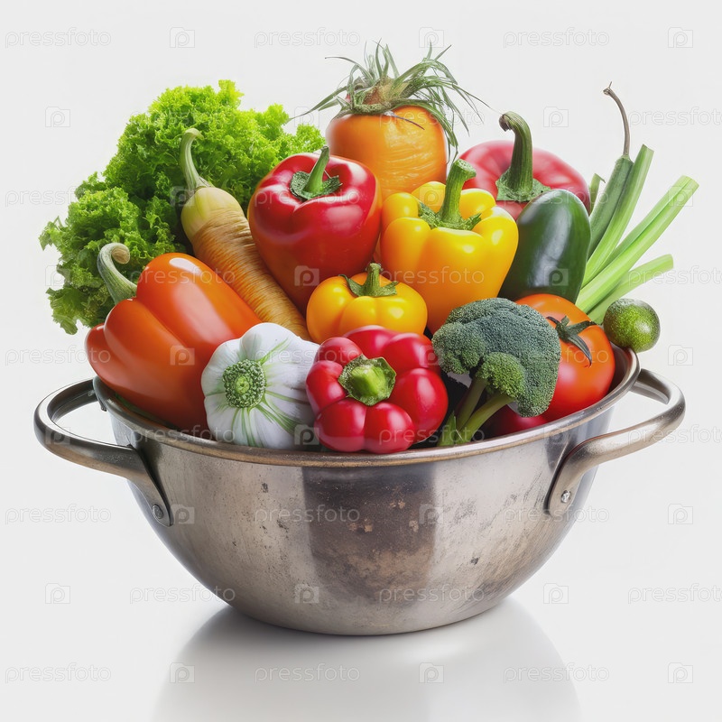 Свежемытые овощи в большой серебряной миске на белом фоне