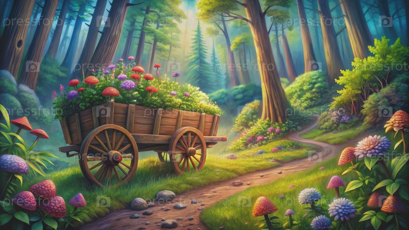 Деревянная тележка, заполненная цветами, отдыхает на тропе в солнечном лесу