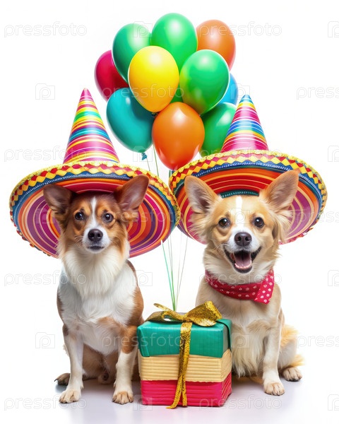 Счастливые мексиканские собаки празднуют с помощью воздушных шаров и подарков