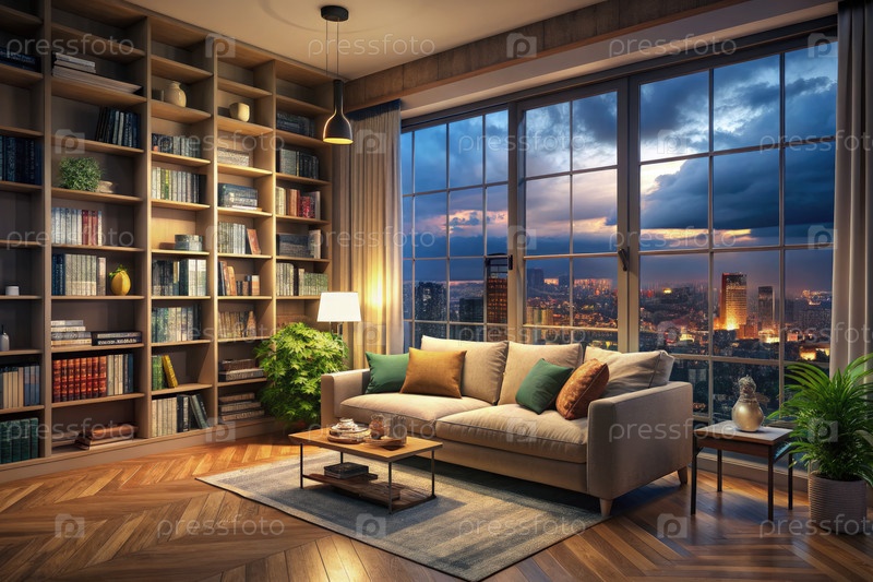 Вечерний вид из гостиной современной квартиры с большим книжным шкафчиком