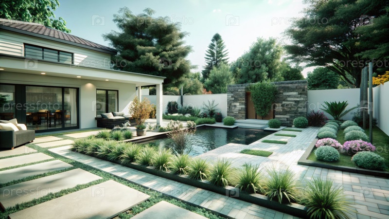 Элегантный ландшафтный дизайн заднего двора с тихой зоной бассейна, окруженной пышной зеленью и современными элементами гардероба