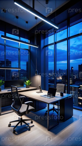 Черный офисный интерьер в комплекте со стильной мебелью и окружающим освещением ночью