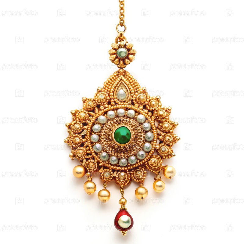 Золотой тон Maang Tikka с зеленым драгоценным камнем и жемчужиной. генеративный AI