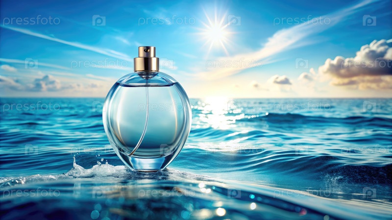 Роскошная стеклянная бутылка с парфюмом плавает на океанских волнах со солнечным небом