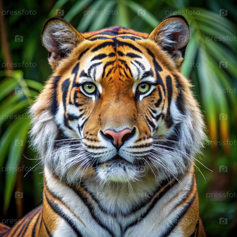 Близкий портрет величественного тигра в пышном зеленом листье