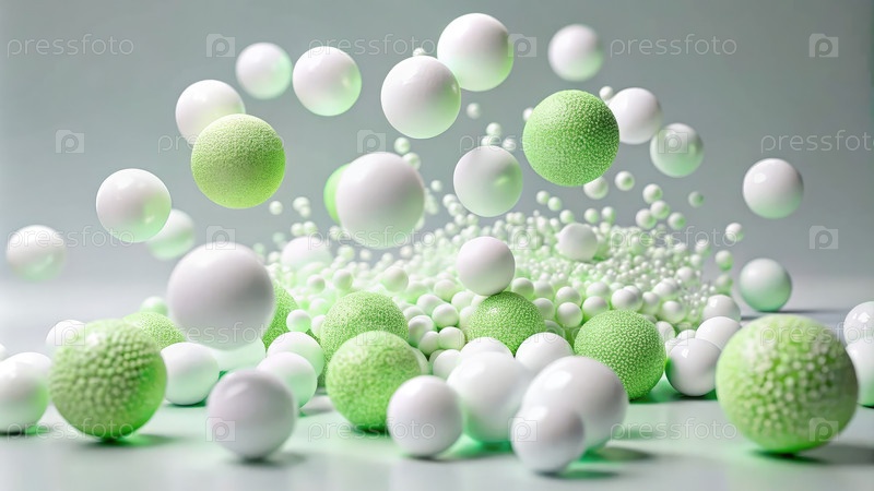 Белые и зеленые сферы, плавающие и разбросанные на светло-серой поверхности