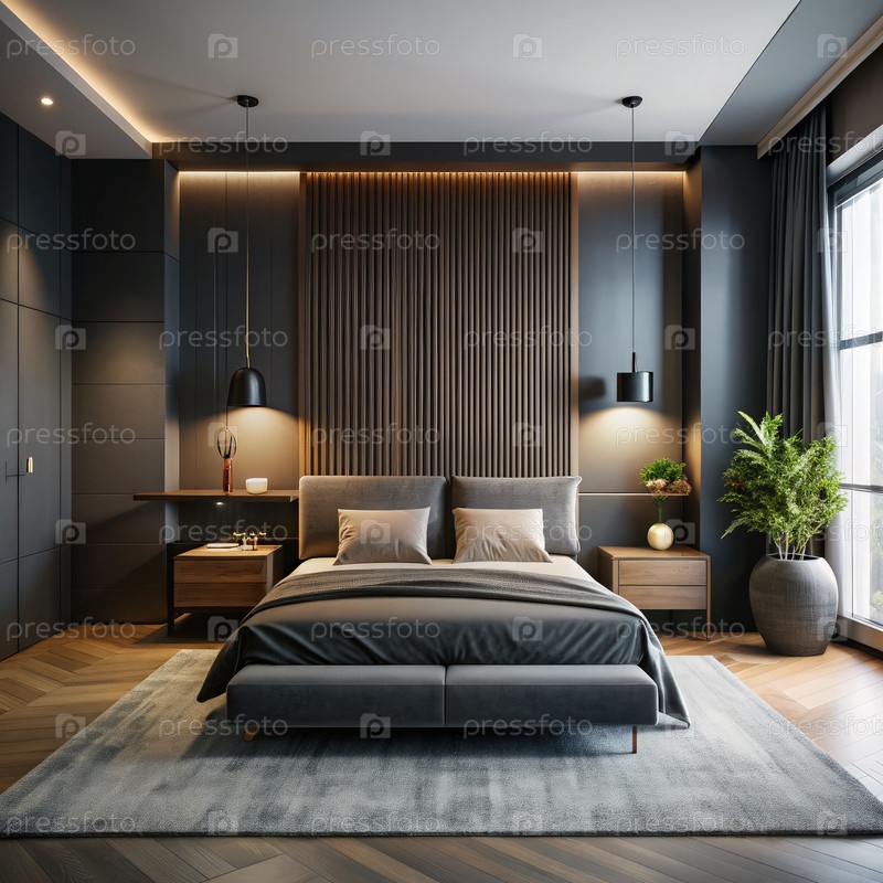 Calm and Inviting Dark Modern Minimalism Bedroom Design With Natural Light in Contemporary Home. Generative AI