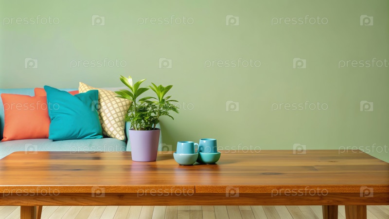 Уютная гостиная с деревянным столом и красочными подушками в расслабляющей атмосфере