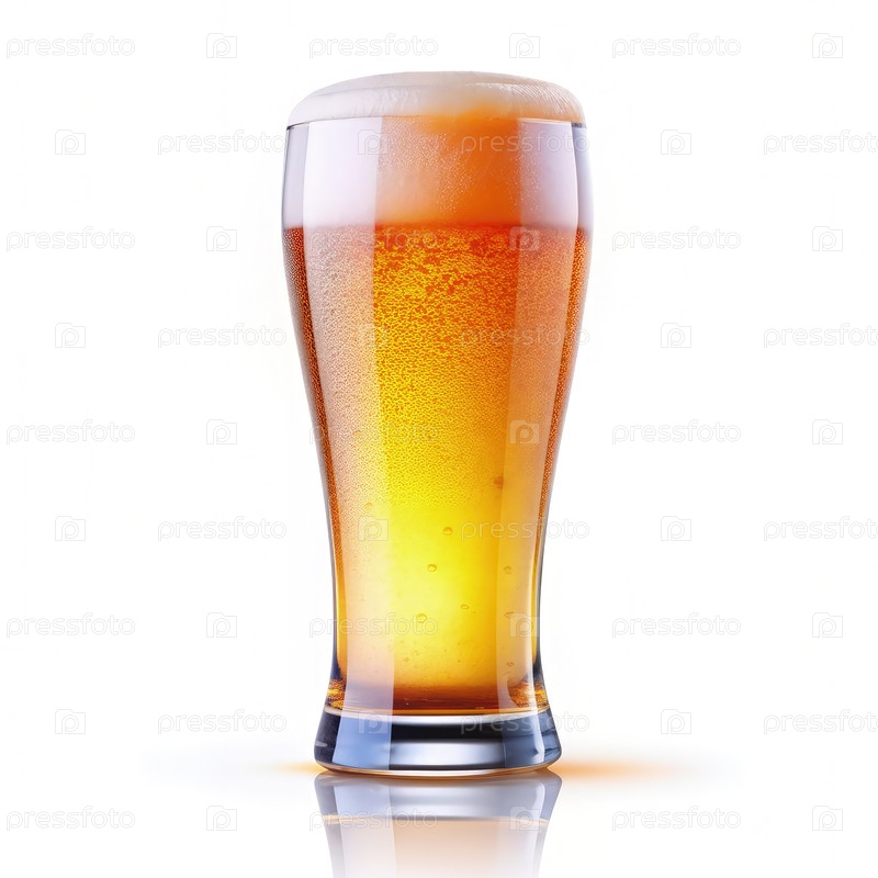 Высокий стакан холодного пива с кремовой головой на белом фоне