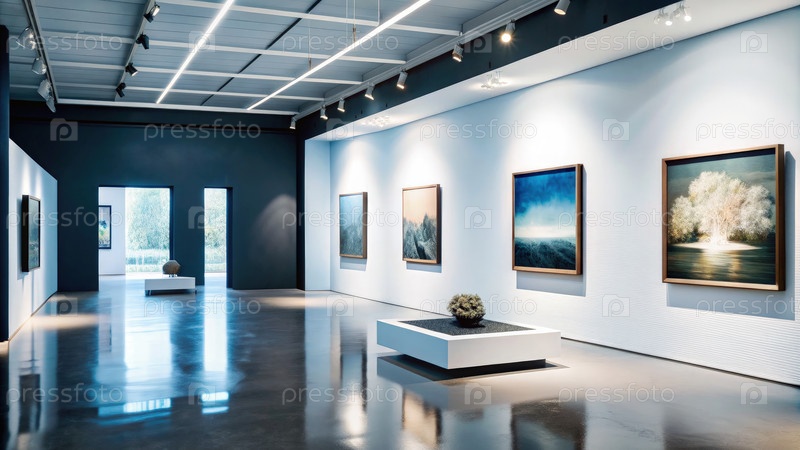 Интерьер современной художественной галереи, в котором представлены произведения современного искусства и уникальные скульптуры в элегантной обстановке