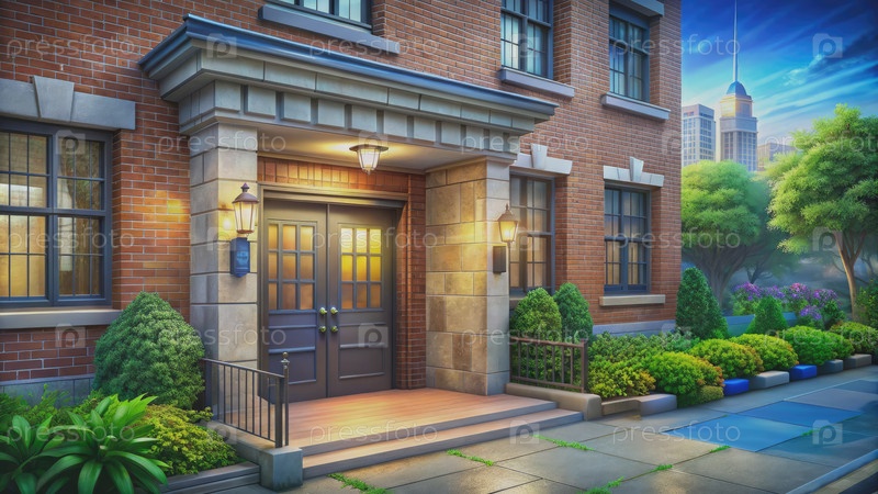 Вход в кирпичный полицейский участок с зеленым ландшафтом и горизонтом города