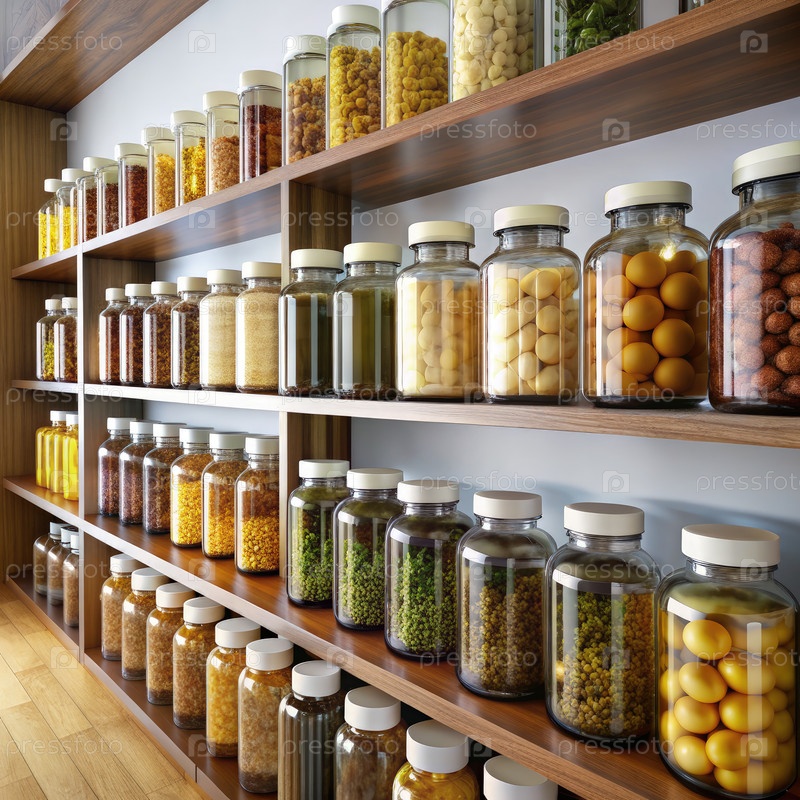 Коллекция красочных добавок, аккуратно организованных на деревянных полках в современном оздоровительном пространстве