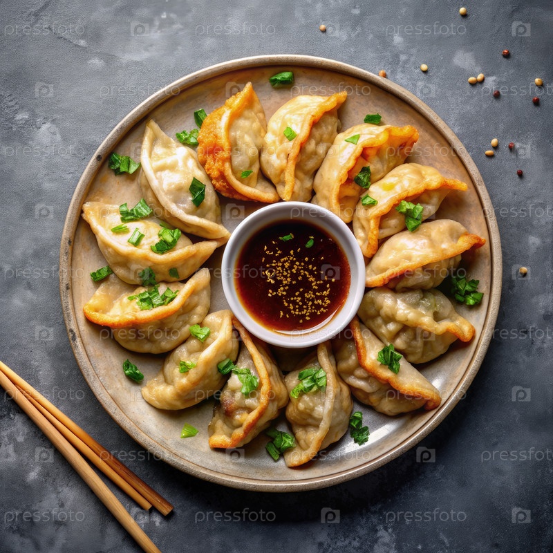 Хрустящие жареные пельмени Gyoza с соусом на тарелке