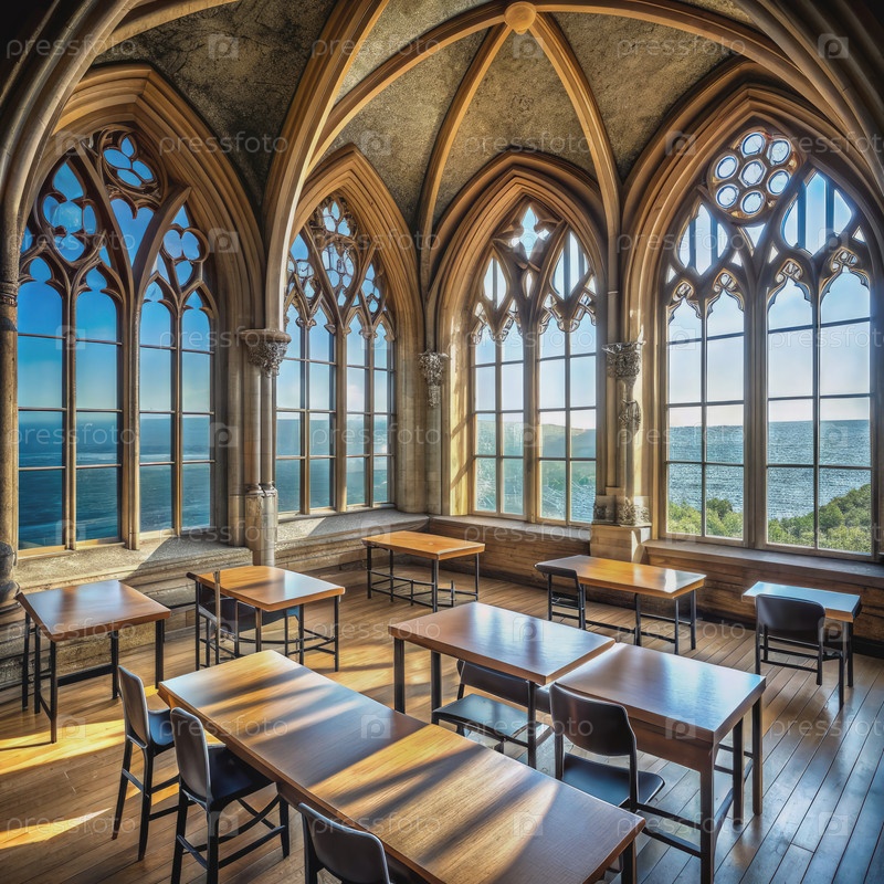 Пустой класс с видом на океан в школьном здании Соединенного Королевства