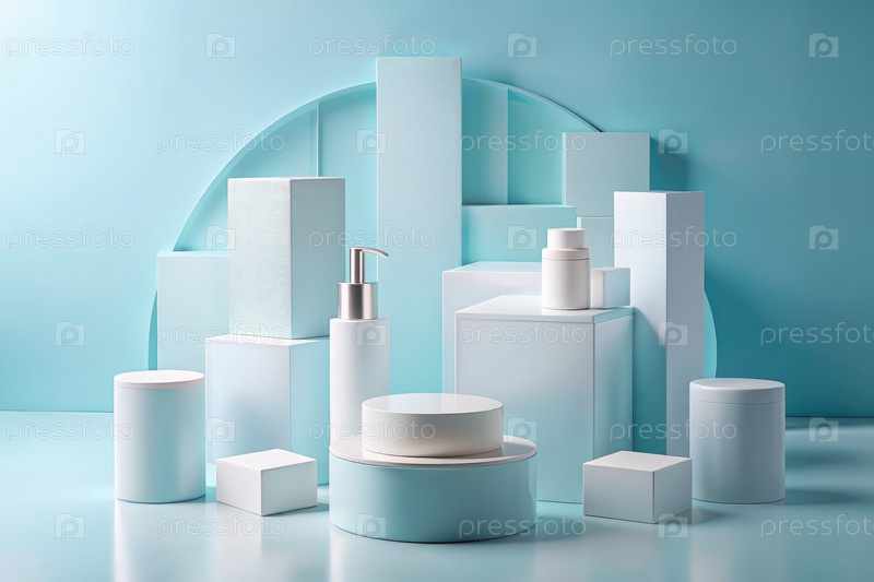 Подиумный дисплей с цилиндрическими платформами и белыми бутылками продуктов