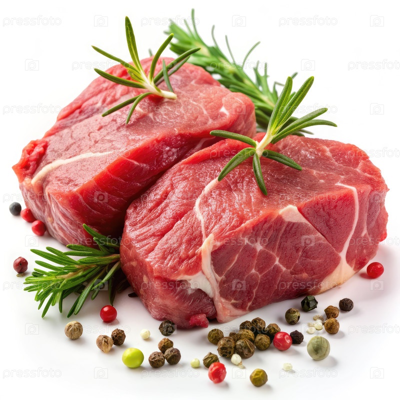 Стейки из говядины с розмарином и перечными зернами на белом фоне