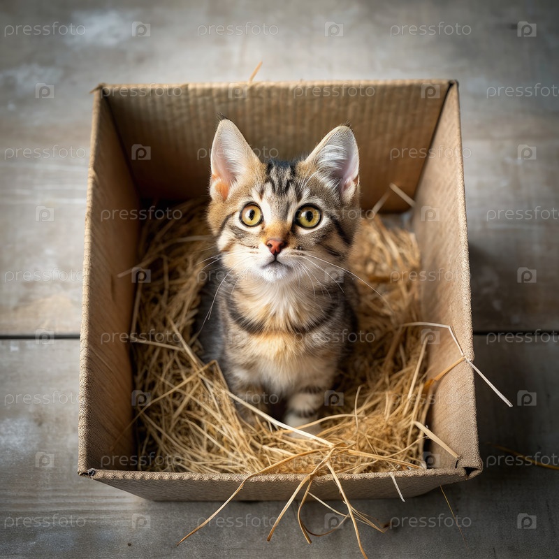 Милый котенок в картонной коробке