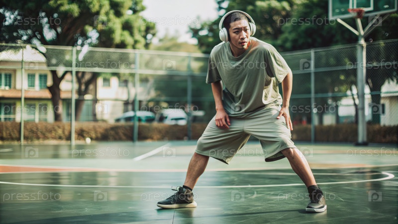 Спортсмен в сверхразмерной рубашке растягивается на открытом баскетбольном поле
