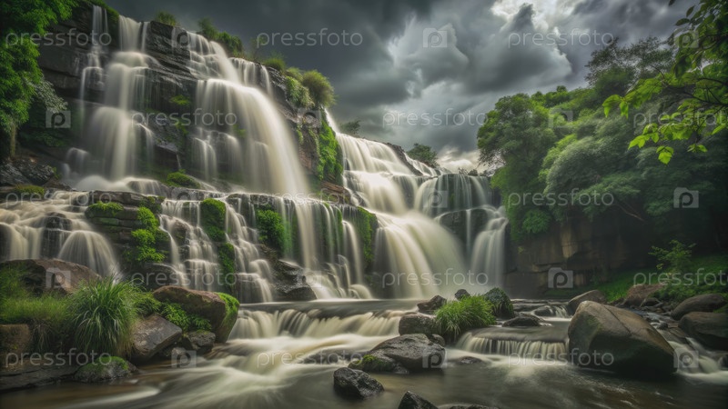 Величественный водопад каскадирует сквозь пышные зеленые тропические леса под бурным небом
